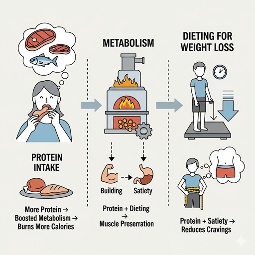 또한 단백질은 근육량을 유지하거나 증가시킵니다. 근육은 지방보다 대사율이 높아, 근육량이 1kg 증가할 때 기초대사량이 약 13-50kcal 정도 더 올라갑니다. 다이어트 중 칼로리 제한으로 근육이 손실되면 대사량이 떨어지지만, 고단백 섭취는 이를 방지합니다. 여러 연구에서 고단백 식단을 실천한 그룹이 저단백 그룹보다 대사량이 5-10% 높아진 것으로 나타났습니다.